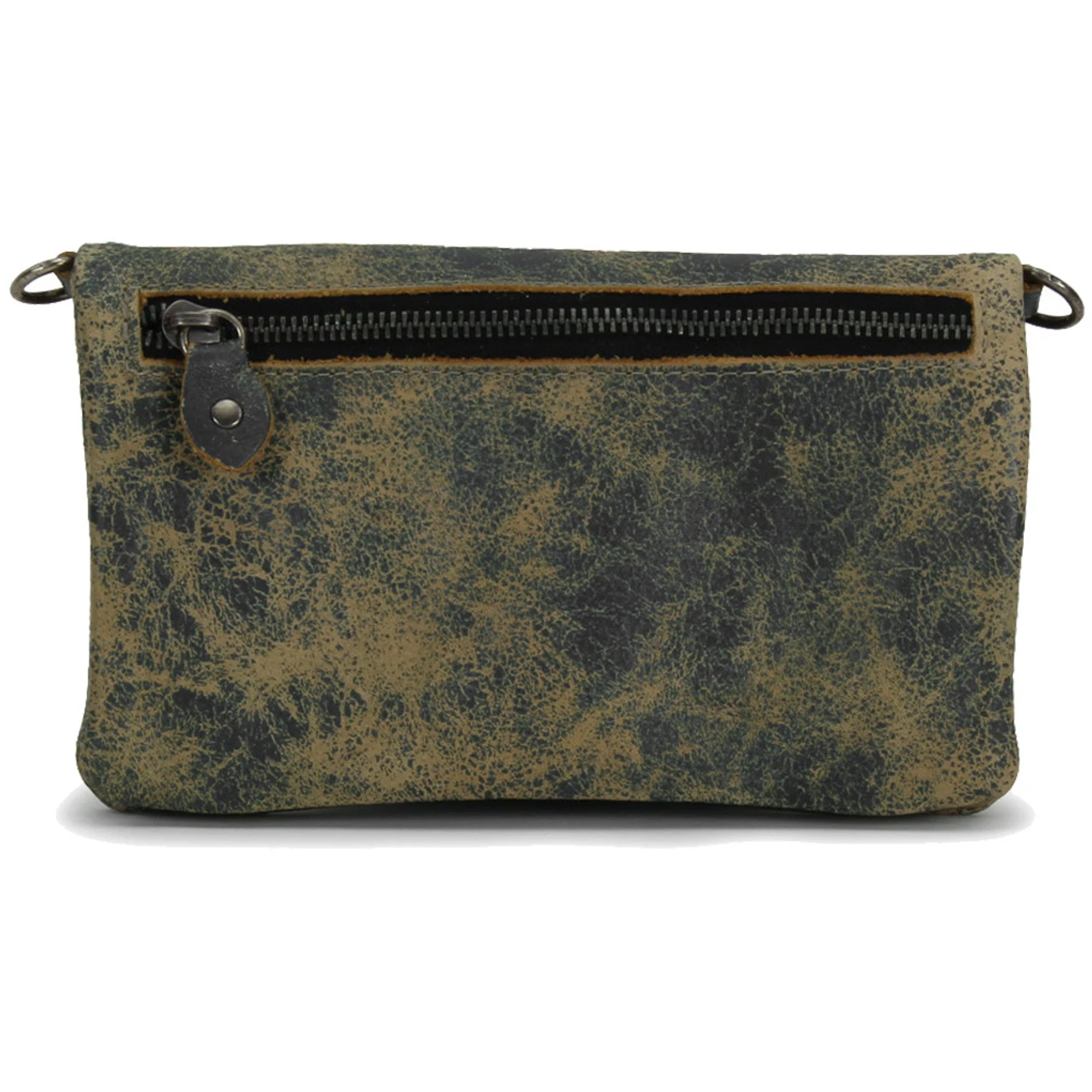 - 2 Inner zippered pockets, 1 outer zipper pocket, studded leather zipper pulls