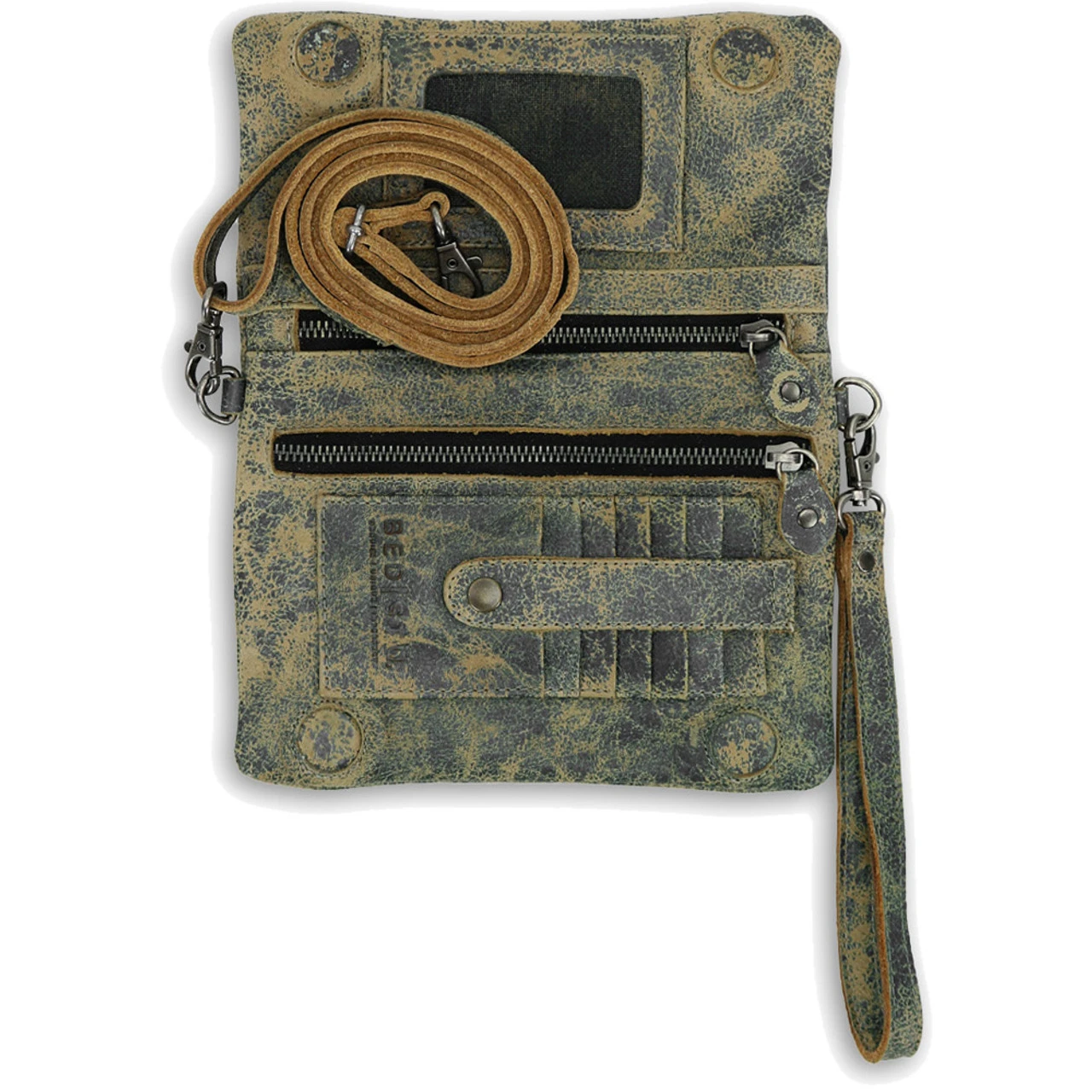 - Comes with two removable leather straps: clutch and crossbody