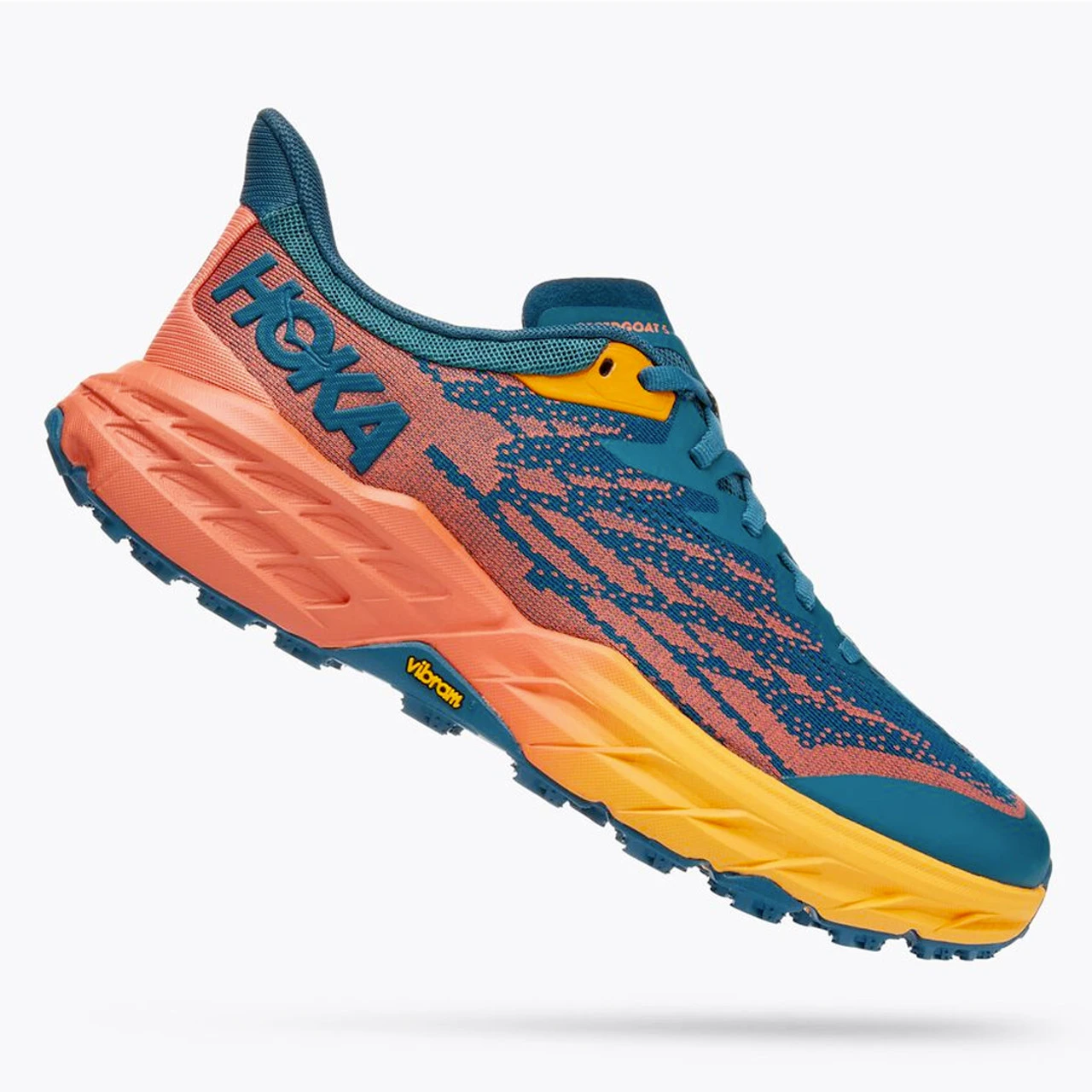 Grippy. Cushioned. Trailblazer. A workhorse designed for technical trails, the Speedgoat returns with less weight and more traction. This trail beast is updated with Vibram Megagrip with Traction Lug for enhanced grip on loose soil. Retaining the same stack height and rocker profile, the Speedgoat 5 employs a lighter midsole compound and heartier, double layer jacquard mesh to inspire confidence on any terrain.
