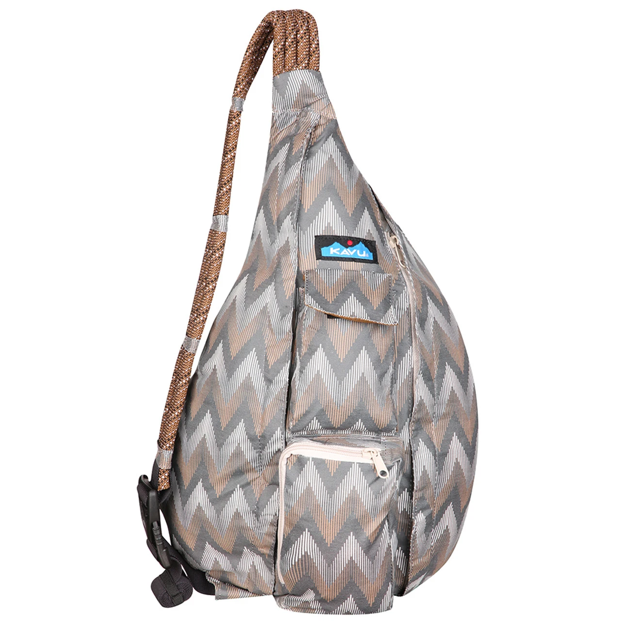 Sling pack with adjustable rope shoulder strap, two vertical zip compartments, two key or cell phone pockets, padded back with KAVU embroidery.