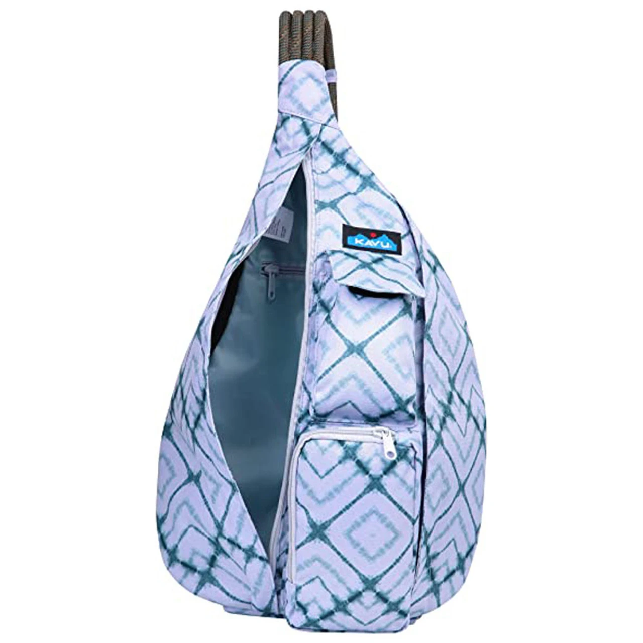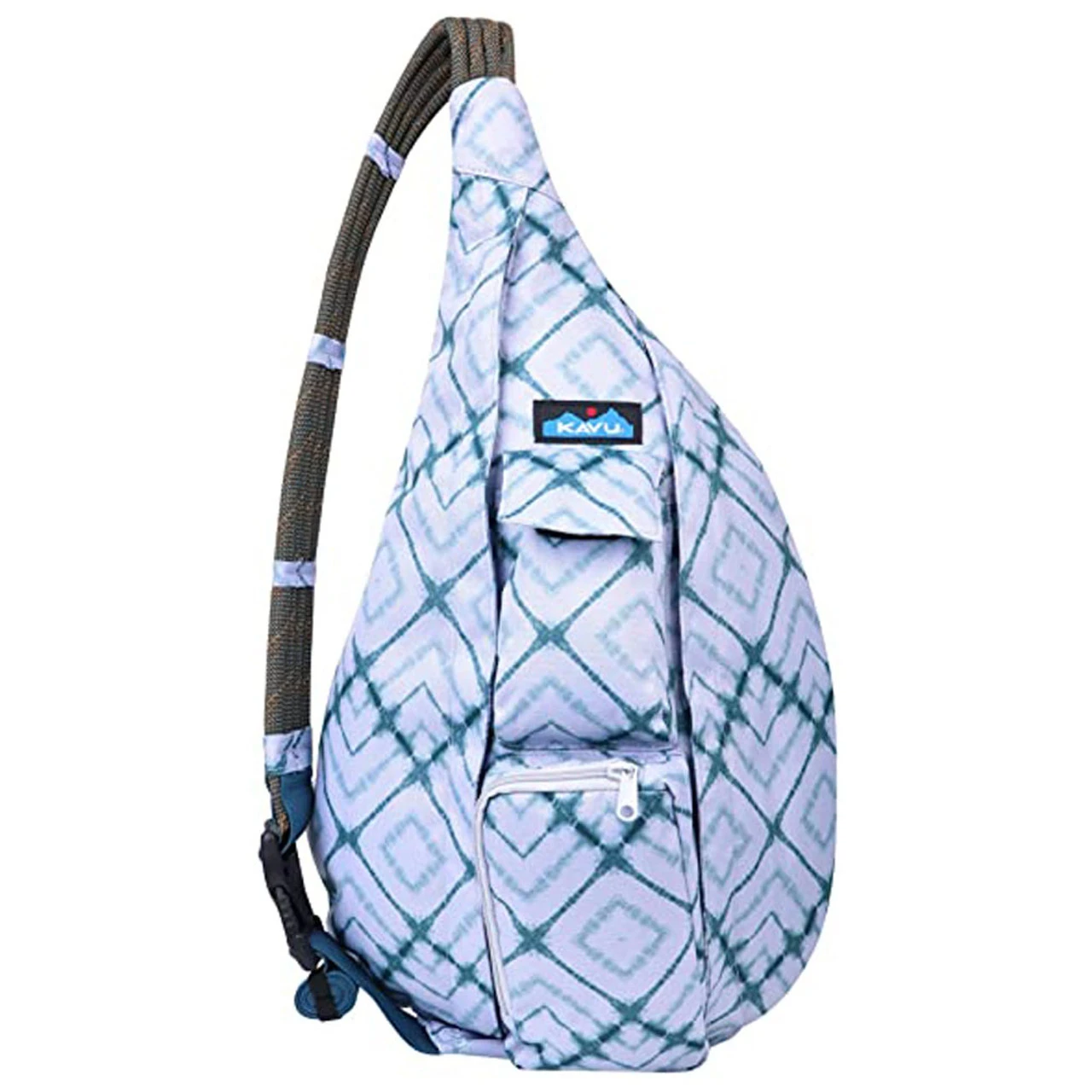 It also has an ultra-comfortable adjustable rope shoulder strap with side release buckle, two vertical zip compartments, two key or cell phone pockets, and a padded back with KAVU embroidery.