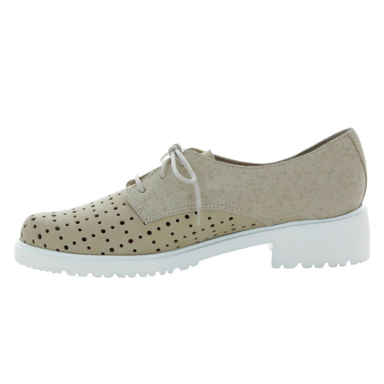 The women’s Durell oxford by Munro features a funky, perforated, lace-up design with a printed leather & nubuck upper.