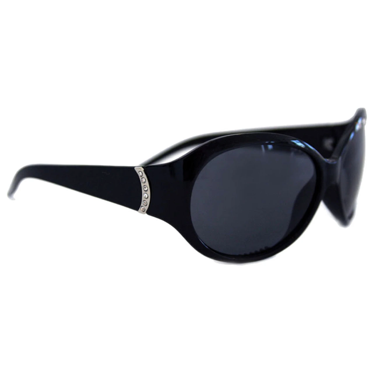 - Frame & Lens:Â Shiny black frame with clear stones and silver metal accent on temples