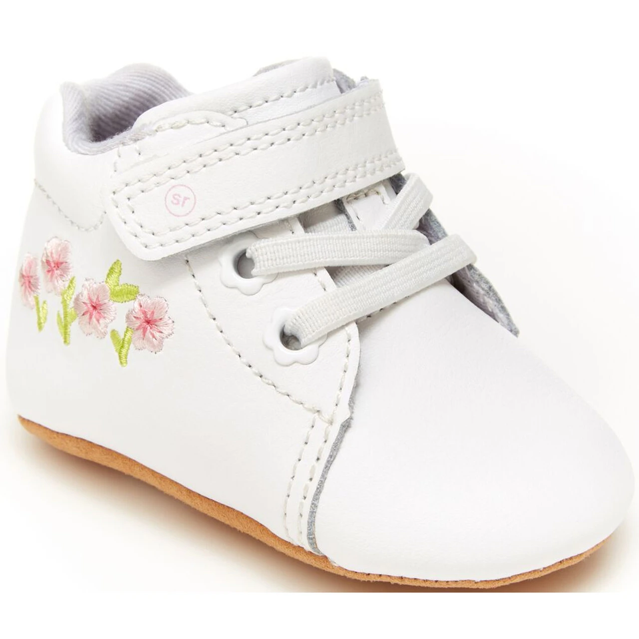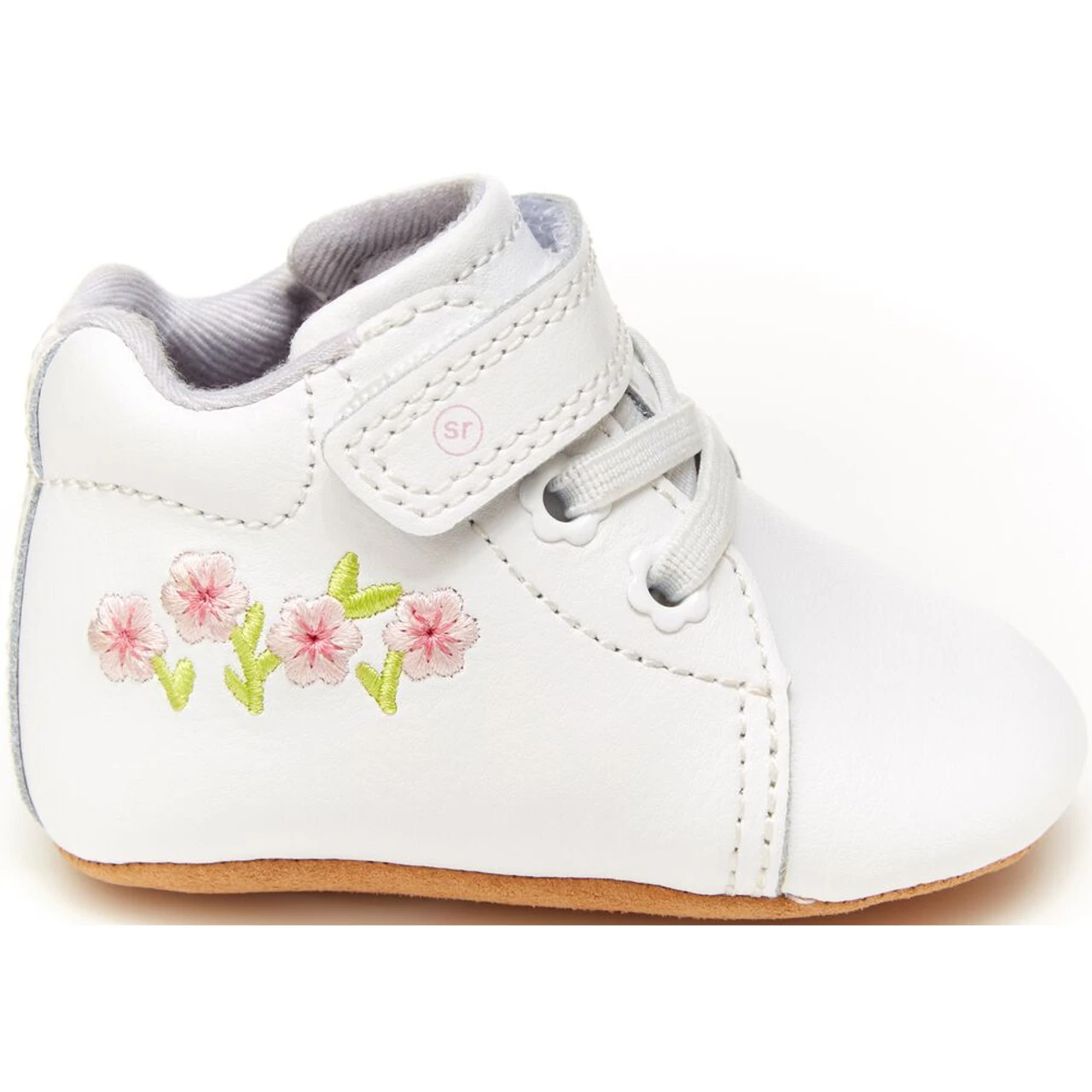 Features a premium leather upper with pretty floral embroidery and faux lace-up detail.